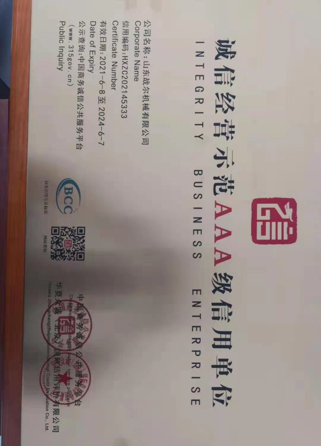 重合同守信用AAA级信用企业